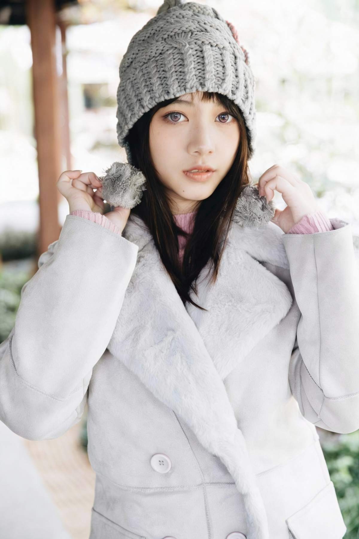 首先,雪景拍攝時,建議選擇淺色系妝容,如裸粉或蜜桃色腮紅,搭配微光澤的底妝,能在白雪映襯下顯得格外清新。此時若配上灰棕色或淡紫色的美瞳 – 如Evercolor 1day 的 Tear Muse 或 Rose Muse – 眼神會更柔和,與雪景的純淨氛圍相呼應。拍照時可嘗試在雪地裡輕輕回眸,或用手指輕觸雪花,營造夢幻感。