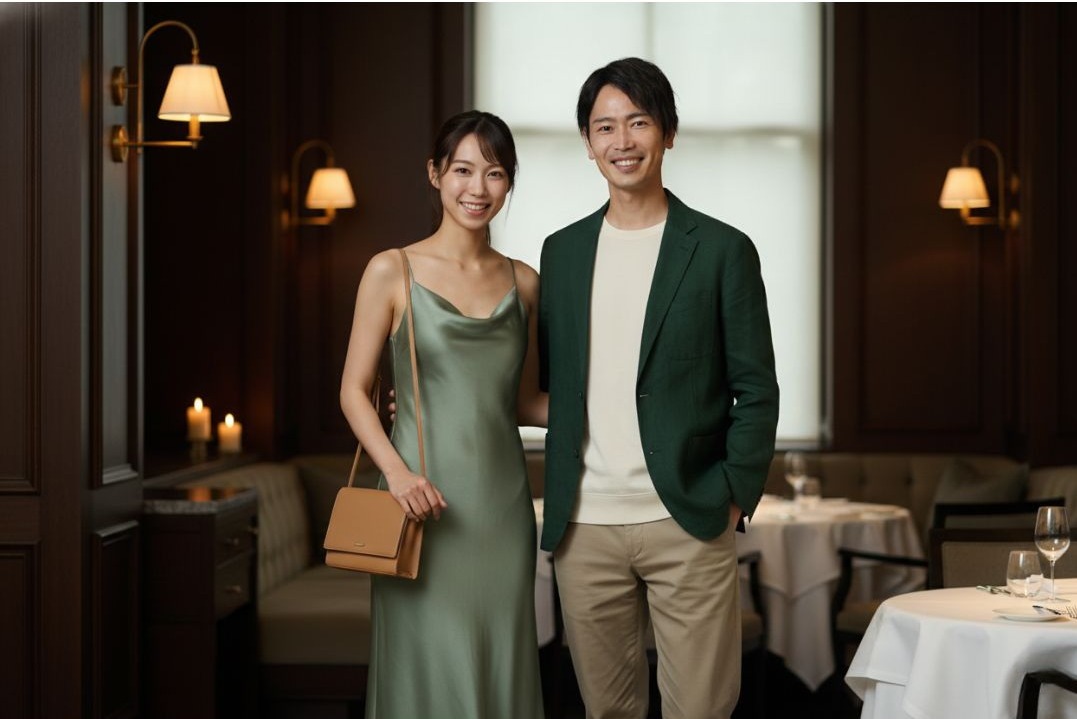 - 女生 Look: 選擇棉麻、真絲或羊絨混紡的天然面料。一件剪裁極簡的亞麻連身褲,或是緞面材質的直筒長裙,顏色推薦「鼠尾草綠 (Sage Green)」或溫暖的「燕麥色」。搭配極簡設計的皮革手袋,展現知性優雅的氣質。