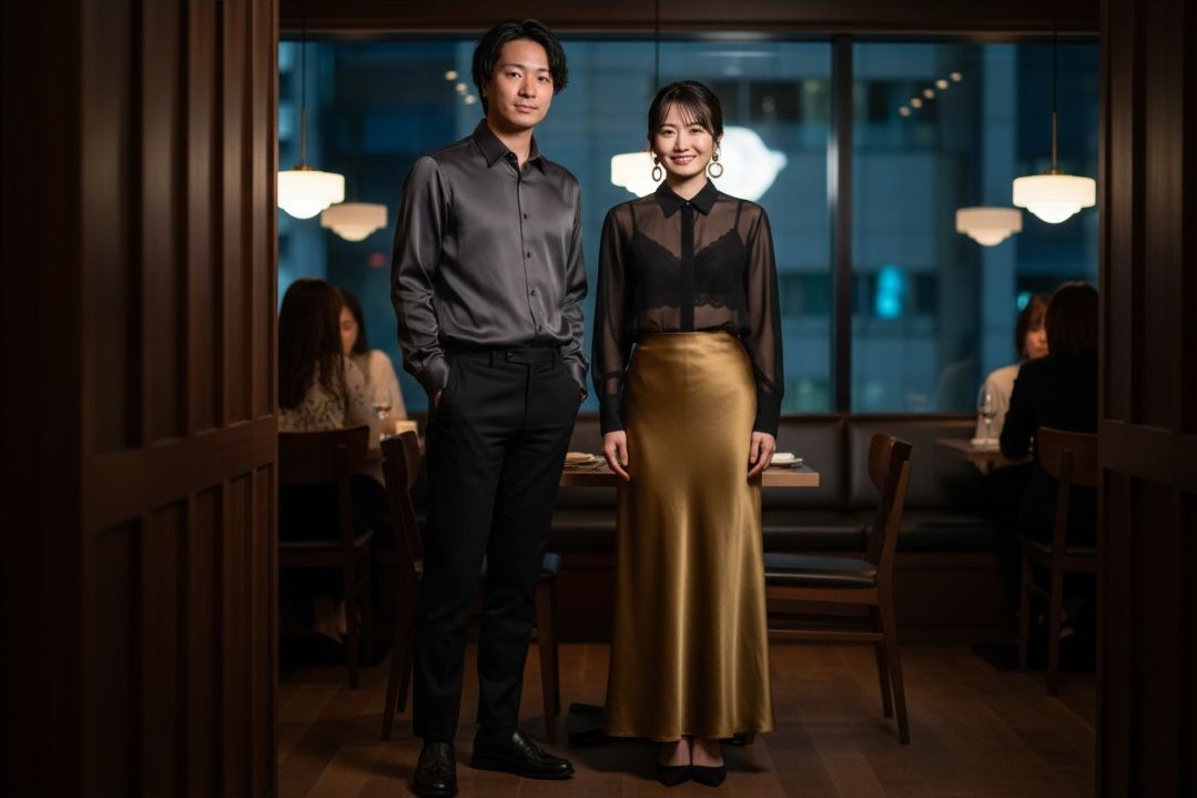 - 情侶穿搭術: 這裡的關鍵是「材質呼應」。女生的透視感與男生的絲質光澤,在燈光下會形成一種高級的視覺流動。你們不必穿同一個顏色,黑金配色或深紅與黑的搭配,都能展現出都會情侶的摩登張力。